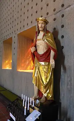 Erst im Jahr 1940 kehrten die Saarlouiser nach dem Ende des Frankreichfeldzug in die entvölkerte Stadt zurück. Das Pfarrhaus war zu Kriegsbeginn durch die meteorologische Station der Artillerie, danach durch den Bund Deutscher Mädel beschlagnahmt worden und wurde der Pfarrei erst nach zermürbenden Verhandlungen zurückgegeben.[28] Aus Anlass der glücklichen Heimkehr wurde im Jahr 1940 eine hölzerne Christusfigur als Votivgabe gestiftet und durch den in Koblenz tätigen Bildhauer Wilhelm Tophinke, der von seiner Ausbildung her der Wiedenbrücker Schule entstammte, geschaffen. Die Aufstellung der Figur erfolgte im Jahr 1941.