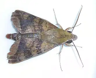 Die Raupen sind schwarz, grün oder braun, mit gelben Seitenlinien, unter denen bei den Segmentgrenzen rote Punkte liegen. Die Seiten sind zudem mit feinen weißen Punkten übersät. Eine blasse, lilafarbene Rückenlinie ist ausgebildet. Die Stigmen sind weiß gepunktet. Das kräftige Analhorn ist braun und leicht gekrümmt. Vom letzten Segment reicht ein weißlicher Fleck von der Basis des Analhorns nach vorne. Der Nachschieber ist hellbraun.[1]