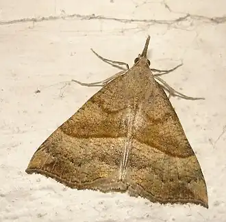 Nessel-Schnabeleule (Hypena proboscidalis) in typischer Ruhestellung mit dachförmig zusammengelegten Flügeln und rüssel- bzw. schnabelartig vorgestreckten Palpen | ||||||||||||