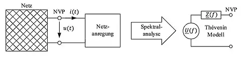 Messungen zeigen, dass weder Standort noch die Art des Netzes einen direkten Einfluss auf die Netzimpedanz haben. Die an Netzverknüpfungspunkten gemessenen Verläufe unterscheiden sich zwar stark in ihrer Lage, weisen aber in ihrem Verlauf sehr ähnliche Muster auf.[1] Die elektrischen Eigenschaften eines Netzverknüpfungspunktes (NVP) zum öffentlichen Elektroenergieversorgungssystem lassen sich vereinfacht nach dem Thévenin-Theorem mit einer Spannungsquelle sowie einer komplexen Netzimpedanz beschreiben. Beide Parameter sind frequenzabhängig und variieren zeitlich in gewissen Grenzen. Die Netzspannung ist meistens bekannt und kann zudem relativ einfach gemessen werden. Die Netzimpedanz an einem NVP lässt sich bei der Netznennfrequenz in einigen Fällen mithilfe von Betriebsmittelkenndaten analytisch abschätzen. Eine exakte Bestimmung der Netzimpedanz kann jedoch nur durch eine messtechnische Identifikation erfolgen. Dies gilt insbesondere für Frequenzen oberhalb der Netznennfrequenz, da dort analytische Ansätze mit großen Fehlern behaftet sind und den wirklichen Frequenzverlauf der Netzimpedanz nicht korrekt widerspiegeln. Daher gab es in den letzten Jahren verschiedene Forschungsinitiativen, um die Netzimpedanz genau ermitteln zu können, da das Wissen um die Netzimpedanz maßgeblich für einen sicheren und zuverlässigen Betrieb einer dezentralen Stromversorgung ist.[2]