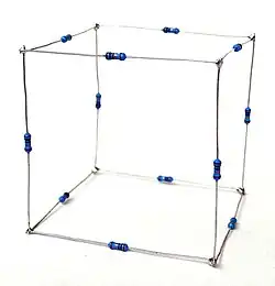 Ein Problem der Netzwerkanalyse ist der sogenannte Widerstandswürfel, der von zwölf gleichen würfelförmig miteinander verlöteten ohmschen Widerständen gebildet wird. Für diese Konstruktion ist der Gesamtwiderstand über die Raumdiagonale A'C zu ermitteln.