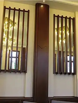 Der Spieltisch für die Orgel steht auf der Empore, die Klangabstrahlung erfolgt von den Resonatoren der Kienle-Orgel, die seitwärts im Chorraum an einer tragbaren Zwischenwand dekorativ in Flügelform montiert sind.[14]