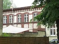 Dem Haupthaus schließt sich ein spitzgiebeliges turmähnlich aufragendes Treppenhaus an, das die bauliche Verbindung zwischen dem Haupthaus und der Empore im Anbau bildet. Von hier gelangen die Besucher in die Mehrzweckräume und auf die Empore. Auf die christliche Nutzung des Gebäudes verweist die Aufschrift an dem geklinkerten Eckteil: Neu-Apostolische Kirche unter dem großen typischen NAK-Kirchensymbol. In der zweiten Etage befinden sich Wohnungen.[10]