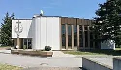 Die Neuapostolische Kirche wurde Anfang der 1980er Jahre am Grundstück Prechtlerstraße 14 nahe der katholischen Pfarrkirche St. Antonius erbaut. Das Gelände, auf dem sich die Kirche befindet, liegt inmitten einer umzäunten Grünfläche und umfasst neben der Kirche auch Nebengebäude und einen Parkplatz. Beim Kirchenbau selbst handelt sich um einen längsrechteckigen, an der Westseite stufenweise eingezogenen Kirchenbau in Stahlbeton-Skelettbauweise mit Ziegelausfachung, wobei die Betonsichtflächen stark gegliedert und durch reliefartige Strukturen akzentuiert wurden. Das Dach wurde als einschaliges Flachdach mit Kupfereindeckung ausgeführt. Der Eingang befindet sich in der Nordwestecke und ist durch einen Rücksprung in der Fassade überdacht. Darüber befindet sich das Emblem der Neuapostolischen Kirche mit Kreuz-, Sonnen- und Wassersymbol.