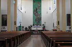 Das Kircheninnere zeigt an der leicht geschwungenen Chorwand das großflächige Mosaik Fischzug Petri vom Maler Karl Bauer 1962. Auch die Glasgemälde in der Taufkapelle schuf Karl Bauer 1962.