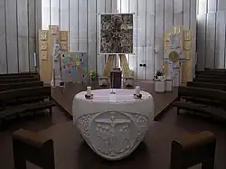 Das Sakramentskreuz, das den Tabernakel beinhaltet, ist als Kreuz ausgebildet, das mit den Problemen der Menschheit umrankt wird. Zwölf Aluminiumabgüsse wurden als Weihekreuze in der Mitte der zwölf Wandsegmente befestigt.