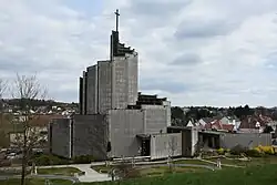 Die unter Denkmalschutz[3] stehende Kirche ist ein Stahlskelettbau, dessen Wände durch mit Marmorsand beschichtete Polyester-Harzplatten verkleidet wurden. Für die Unterdecken wurde Holz und für die Böden keramische Beläge verwendet. Die Gestaltungsidee der Kirche ist eine Spirale zu Gott und eine Treppe zum Himmel[4].
