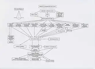 Die nach außen demonstrierten strengen und staatsähnlichen Strukturen waren dabei in weiten Teilen rein symbolisch und dienten lediglich der Verdeutlichung dieses künstlerischen Ansatzes. So zeigte das einem schematisch dargestellten Regierungsapparat nicht unähnliche NSK-Organigramm neben den tatsächlich existenten Gruppen stets auch „virtuelle“ Organisationseinheiten wie z. B. an der Spitze der Gesamtorganisation den „immanenten konsistenten Geist“, lenkende und kontrollierende Gremien wie einen „Konvent“ und einen „Generalrat“ oder an der Basis der Strukturen ein angebliches „Operationsforschungs-Büro“, welchem unter anderem eine „vollziehende Gewalt (technische Grundlage)“ sowie ein „Gericht ohne Entscheidungsbefugnis“ unterstellt sein sollten.[12]