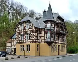 Der Neubau von 1889 schließt direkt an das Hinterhaus an. Über dem massiven Erdgeschoss besteht das Gebäude aus Nadelholzfachwerk, dessen Gefach mit Backsteinen ausgemauert und verputzt ist. Das Fachwerk ist dekorativ ausgeführt mit Andreaskreuzen, Rauten, Kreisen und verzierten Streben. Während der parallel zur Straße verlaufende Gebäudeteil zweigeschossig ist, erhebt sich rechts der Gebäudemitte ein breiter, dreigeschossiger Querflügel. Das schieferbedeckte Dach mit weiten Überständen wird an allen drei Giebeln durch Krüppelwalme abgeschlossen. Links des straßenseitigen Giebels befindet sich ein zweigeschossiger, achteckiger Erkerturm auf fünf Knaggen mit ebenfalls verschiefertem Spitzdach. Die Fenster des Turms haben auf beiden Ebenen Kleeblattbogen-Oberlichter mit rautenförmigen Sprossen und Bleiverglasung. Ebenfalls zur Straße liegt vor dem zweiten Obergeschoss ein überdachter, dreiachsiger Balkon mit rundbogigen Öffnungen, der von Kragbalken gestützt wird.
