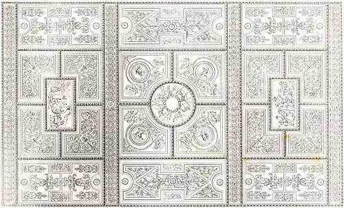 Im anschließenden Grünen Saal oder Saal der Handzeichnungen, so benannt nach der lichtgrünen Färbung seiner Wände, wurde die zum Zeitpunkt der Museumseröffnung ungefähr 30.000 Blätter umfassende Sammlung der Handzeichnungen aufbewahrt. Prunkstück der Innenausstattung war die flachgewölbte, durch vier gemalte Gurtbögen „in der Farbe des gebrannten Thones“[40] und durch vergoldete Zinkgussleisten gegliederte Decke. Um ein kräftig dunkelblaues Feld in der Mitte tanzte eine Gruppe kranztragender Kinder. Vier erhabene Medaillons zeigten die berühmten Kupferstecher und Zeichner Rembrandt van Rijn, Anthonis van Dyck, Lucas van Leyden und Hans Holbein den Jüngeren. Im vorderen und hinteren Feld der Decke schilderten die beiden rechteckigen Gemälde Die Erfindung der Malerei und Die Industrie des Kupferdruckes, die dazwischenliegenden Flächen füllten Szenen mit kleineren Figuren, Allegorien, Ornamente und Arabesken in hellen Farben.