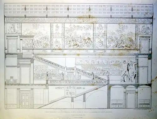 Diese Bauarbeiten waren 1847 so weit gediehen, dass mit dem aufwendigen Innenausbau begonnen werden konnte. Die Märzrevolution 1848 führte zu Verzögerungen bei den Bauarbeiten, die aber zu keiner Zeit vollständig unterbrochen wurden. Sobald die jeweiligen Räume vollendet waren, begann die Aufstellung der Sammlungen, die nacheinander von 1850 bis 1859 eröffnet wurden.[31] Arbeiten an Teilen der Innenausstattung, vor allem an den Wandfresken im Treppenhaus, zogen sich jedoch noch bis 1866 hin.