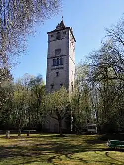 - Zwei Torgebäude – das Westtor mit Turmuhr und das Osttor mit einem Fresco von Herterich, München, das den Hl. St. Georg als Reiter darstellt.