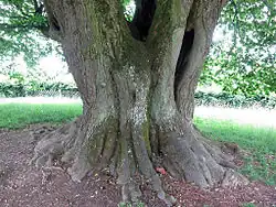 Weil die Verankerungen aus den Ästen zu reißen drohen, ist der Baum gefährdet. Die aufstrebenden Stämme sind durch Fäule ausgehöhlt und bilden kaum frisches Holz.[12]