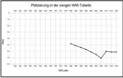 | 6 WM-Spiele 0 Siege 3 Unentschieden 3 Niederlagen 4:14 Tore | |