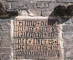 Der Text der in die Turmwand eingelassenen Inschrift lautet: „Anno domini 1411 edificata est haec turris per magistrum Nicolaum craft de stettin.“ Übersetzt bedeutet dies: „Im Jahre des Herren 1411 ist dieser Turm durch Meister Nikolaus Kraft aus Stettin aufgeführt worden.“