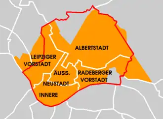 Das Gemarkungsgebiet bestand bereits im 19. Jahrhundert weitgehend in seiner heutigen Ausdehnung. Ausnahmen hiervon sind die nördliche Leipziger Vorstadt und die für die Sächsische Armee geschaffene Albertstadt, die als autarke Militärstadt bis 1945 formell selbstständig blieb. In den 1950er Jahren wurde der Südosten Trachenberges, der bis 1897 unter dem Flurnamen Jeßnitz zum eigenständigen Gutsbezirk Wilder Mann gehört hatte und danach mit der Siedlung Oberer Hecht bebaut worden war, dem Stadtteil Leipziger Vorstadt zugeschlagen und liegt seitdem in der Gemarkung Neustadt.