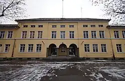 Das Hauptgebäude ist lang gestreckt und besitzt heute zwei Geschosse.[3] An den Seiten des Hauptgebäudes und gegenüber befinden sich drei eingeschossige Gebäude.[3] Die Anlage ist somit insgesamt vierflügelig und achsensymmetrisch aufgebaut.[4] Das Hauptgebäude hat in der Mitte ein Mezzanin und an den Seiten einstöckige Gebäudeteile.[3] Hier gibt es auch eine bauliche Überleitung zu den Seitenflügeln. In der Mitte befindet sich der Haupteingang der Schule. Dieser Haupteingang hat drei Arkaden, hinter dem Haupteingang gelangt man in die Eingangshalle.[4] An den Seiten und über dem Haupteingang kann man an drei und vier gruppierten Fenstern die Aufteilungen der Klassenräume erkennen.[4]