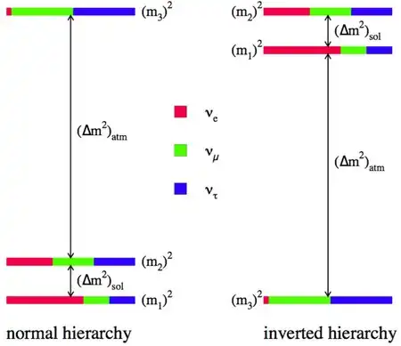 Die Beschreibung „normal“ und „umgekehrt“ bezieht sich auf den Vergleich mit den geladenen Leptonen und deren Anordnung der Massen: . Da in der Superposition der Flavourzustände den größten Anteil vom Tauneutrino hat, wäre es „normal“, wenn der schwerste Zustand wäre, und „umgekehrt“, wenn der leichteste Zustand wäre.