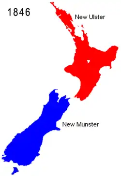 Als am 16. November 1840 Neuseeland per Letters Patent zu einer eigenständigen Kolonie erklärt wurde und damit nicht mehr länger der Kolonie New South Wales unterstellt war, wurden die drei Hauptinseln Neuseelands, die bis dato als Northern Island, Middle Island und Stewart's Island bekannt waren, unter geographischen Gesichtspunkten als New Ulster (Nordinsel), New Munster (Südinsel) und New Leinster (Stewart Island) bezeichnet.[1]