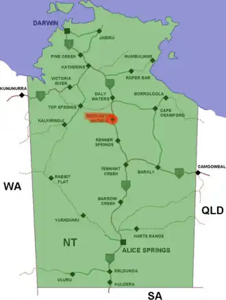1861 erreichte eine Expedition unter Leitung von John McDouall Stuart die Gegend. Nach längerer erfolgloser Suche entdeckten sie eine „wunderbare Wasserdecke“ von 150 Metern Breite und 7 Kilometern Länge. Er nannte sie zunächst Glandfield Lagoon, später wurde sie nach dem Duke of Newcastle, dem Minister der Kolonien, in Newcastle Waters umbenannt.[2] Stuart ließ dort ein Basislager errichten. Mit der Entwicklung der Landwirtschaft entstand ein kleiner Ort, der als Versorgungsstation genutzt wurde.[3]