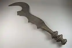 - Ebenso hergestellt von den Ngombe und Doko. Charakteristisch sind gerundete Knubbeln auf der nicht schneidenden Seite der Einfach-Ngulus. Im Allgemeinen sind sie nicht geschärft und eindeutiger als Parade- und Tanzutensilien zu klassifizieren.[18]