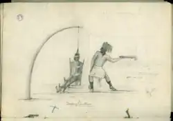 Einige der wenigen Augenzeugen, die ihre Beobachtungen festgehalten haben, sind Camille-Aimé Coquilhat, Alphonso van Gèle und Edward James Glave. Diese Europäer leiteten Stationen im Auftrag des Kongo-Freistaates. Coquilhat beschrieb eine Exekution in Mbandaka im Jahre 1883,[14] Glave eine in Lukolela im Jahre 1885.[15] Glave fertigte vor Ort eine Zeichnung darüber an; diese erreichte Europa und wurde Vorlage für verschiedene Illustrationen in Büchern und Zeitungen.[16] In seinem Buch aus dem Jahre 1892 beschreibt er die Waffe nicht näher. Interessanterweise sieht die Exekutionswaffe in der Illustration des Buches anders aus als in seiner früheren Zeichnung.[15]