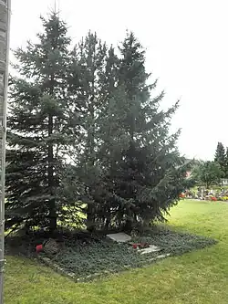 Auf dem Friedhof liegt neben der Kirche als (im Dorf ausgeschilderte) Kriegsgräberstätte ein gepflegtes Gemeinschaftsgrab mit 13 deutschen Soldaten (gemeinsame Namenstafel), die am 15. April 1945 gefallen sind. Es handelt sich um Verteidiger der Flakstellung Nißma. Auf Fotoaufnahmen aus dem Jahre 2003 erkennt man noch deutsche Einzelgrabkreuze und ein Denkmal für bei Nißma gefallene italienische Militärinternierte.[6] An die zivilen Opfer des Bombenangriffs vom 20. Februar 1945 erinnert kein Gedenkstein.