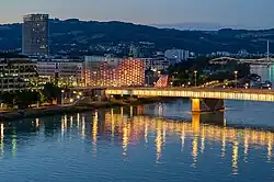 Die Nibelungenbrücke in Linz verbindet die Stadtteile Innenstadt und Urfahr. Sie verläuft in nord-südlicher Richtung über die Wasserstraße Donau und ist 250 Meter lang, 30 Meter breit und liegt auf zwei Betonpfeilern. Die Brückendurchfahrtsbreite zwischen den Pfeilern beträgt 90,1 Meter, die Durchfahrtshöhe 7,52 m bei Normpegel.[1] Die Brücke wurde 1938 bis 1940 errichtet direkt neben der Stelle, an der bereits um 1500 die erste und lange Zeit einzige Linzer Brücke errichtet wurde. Die alte wurde nach Fertigstellung der neuen abgerissen.