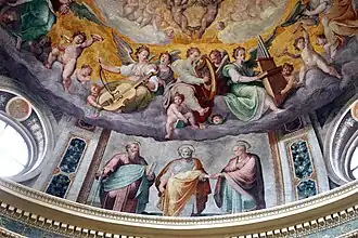 - ↑ "Arte e architettura – Basilica Ss. Nereo-Achilleo" ( des vom 5. Februar 2019 im Internet Archive) Info: Der Archivlink wurde automatisch eingesetzt und noch nicht geprüft. Bitte prüfe Original- und Archivlink gemäß Anleitung und entferne dann diesen Hinweis. auf der Website der Gemeinde von S. Maria in Vallicella (italienisch; zuletzt abgerufen am 11. Februar 2019). Bezüglich der Fresken mit dem Martyrium von Domitilla, Nereus und Achilleus im eigentlichen Kirchenschiff heißt es da: "La loro attribuzione" (d. h. die Zuschreibung der Fresken; Anm. d. Ü.) "è discussa. Per molto tempo si è parlato del Pomarancio." (im Abschnitt "Gli affreschi ed i mosaici"). Die etwas ungelenken Märtyrerszenen der Seitenschiffe gelten ohnehin nur als Werk der "römischen Schule vom Ende des 16. Jahrhunderts" ("Alle pareti, affreschi di scuola romana della fine del Cinquecento rappresentanti scene di martiri."; im Abschnitt "Le navate laterali").