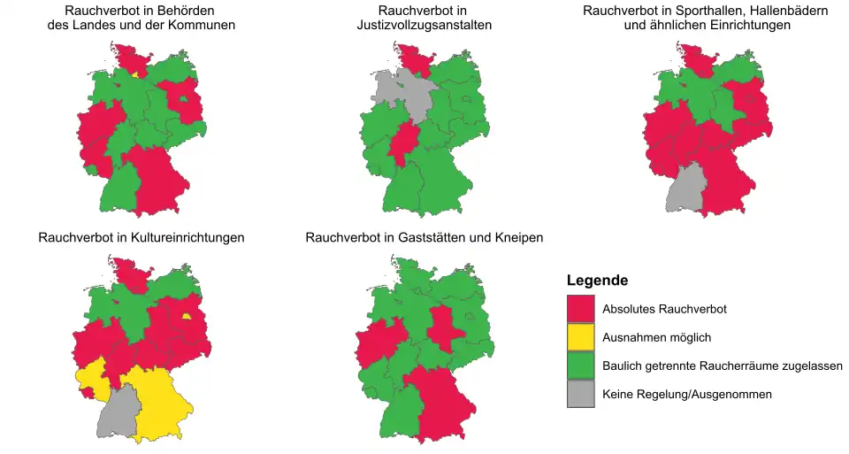 Stand April 2018 gilt ein generelles Rauchverbot für Gaststätten und Kneipen in den 3 Bundesländern Nordrhein-Westfalen, Bayern und im Saarland, in den restlichen 13 Bundesländern gelten grundsätzlich Ausnahmeregelungen für Nebenräume in Gaststätten und für Einraumkneipen unter 75 m². Die Auslegung dieser Ausnahmen kann sich zwischen diesen Bundesländern im Detail geringfügig unterscheiden, so schreibt zum Beispiel Hamburg als einziges Bundesland eine Luftschleuse für Raucherbereiche vor, und in manchen Bundesländern darf in Raucherkneipen kein aufwendig zubereitetes Essen serviert werden.[24]