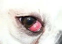Der Nickhautdrüsenvorfall ist ein Vorfall der oberflächlichen Nickhautdrüse (Glandula palpebrae tertiae superficialis), die insbesondere bei Haushunden auftritt. Die Erkrankung kommt vor allem bei unter einem Jahr alten Jungtieren kurzköpfiger (brachyzephaler) Hunderassen wie Amerikanischer Cocker Spaniel, Englische Bulldogge und Lhasa Apso im Zusammenhang mit einer Hypertrophie vor. Bei älteren Hunden ist die Erkrankung sehr selten und meist Folge einer trockenen Bindehaut-Hornhaut-Entzündung (Keratoconjunctivitis sicca) oder eines Lymphosarkoms. Auch im Fall einer Vergrößerung der Drüse, kann es zu einem Nickhautdrüsenvorfall kommen. Die genaue Ursache ist jedoch noch nicht eindeutig geklärt.