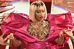 Minaj kombiniert gerne verschiedene Elemente in ihrem Stil und setzt auf aufwendige Kostüme, die von Anime-Charakteren und futuristischer Mode inspiriert sind.[110] Sie setzt auffällige Akzente und experimentiert mit Mode, was ihre Auftritte auf roten Teppichen und in Musikvideos besonders einprägsam macht.[111][112]