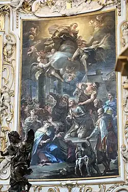 - Deckenfresko Mariä Himmelfahrt, Hauptaltarbild Maria Immaculata und 2 weitere Bilder (Hochzeit der Jungfrau und der Hl. Bernhard bekehrt Wilhelm von Aquitanien), Chiesa della Croce di Lucca, Neapel, (1696–97)