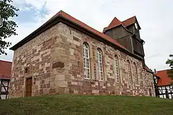 - 1556 wird ein Spätgotischer Saalbau mit geschlossenem Chor und holzverkleidetem Fachwerkturmaufbau genannt der 1721, 1823–25 verändert und ausgebessert wurde.