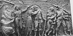 Hinter der Allegorie des Krieges ist das Seitenrelief „Abschied der Krieger“. In diesem Aufbruchrelief sind die ausziehenden Krieger in drei Gruppen dargestellt: