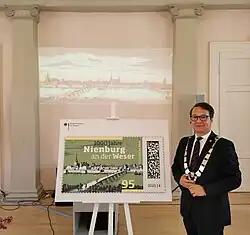 Bürgermeister Jan Wendorf bei der Präsentation des Sonderpostwertzeichens „1000 Jahre Nienburg an der Weser“[2]