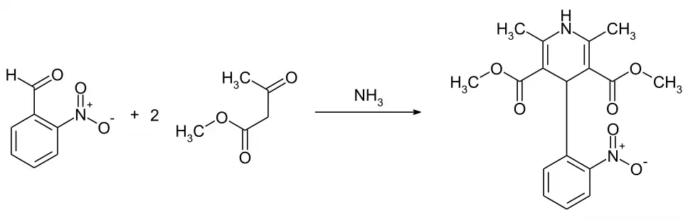 Die Herstellung von Nifedipin erfolgt entsprechend einer Hantzschschen Dihydropyridinsynthese durch die Umsetzung von 2-Nitrobenzaldehyd mit Methylacetoacetat (Acetessigsäuremethylester) in Gegenwart von Ammoniak.[10][11]