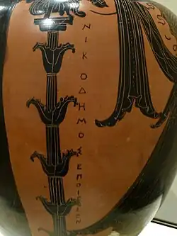 Nikodemos ist einzig bekannt durch seine Signatur Nikodemos epoiesen auf einer schwarzfigurigen Panathenäischen Preisamphora in Malibu.[1] Das Stück lässt sich einer Gruppe von Preisamphoren zuordnen, die mit dem Namen des Charikleides, Archon im Jahr 363/2 v. Chr., beschriftet sind.