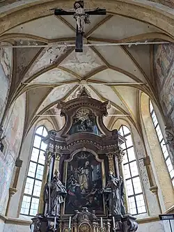 Das Kirchenschiff ist ein quadratischer Einsäulenraum mit einem von einer mittigen Säule aufsteigenden Gewölbe mit einer Achtecksternkonfiguration. Der Triumphbogen ist gekehlt und spitzbogig. Der eingezogene Chor hat einen um drei Stufen erhöhten Fußboden und ein Netzrippengewölbe mit runden Schlusssteinen auf Diensten. Links im Chor ist ein gekehltes Sakristeiportal mit geradem Schluss und Eckkonsolen mit einer spätgotischen Eisenplattentüre und ein abgefastes rechteckiges Sakramentshäuschen. In der Sakristei ist ein Tonnengewölbe mit Stichkappen und ein Sakristeikasten aus dem Anfang des 17. Jahrhunderts.