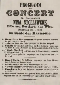 „Die Componistin Nina Edle von Rosthorn geb. Stollewerk, welche schon längere Zeit an den Nerven litt und sich deswegen einige Sommer in den Taunus- und Seebädern aufhielt, ist neuerlich sehr bedenklich erkrankt, und dadurch in der so schön begonnenen Laufbahn und der Kundgebung ihres Talentes in den rheinischen Städten gehemmt worden. Die Aerzte haben ihr auf das Strengste wenigstens auf zwei Jahre sowohl das Reisen als jede künstlerische Aufregung untersagt: sie wird demnächst nach dem mildern Klima ihrer süddeutschen Heimat zurückkehren, wohin sie unsere Anerkennung und unsere Wünsche begleiten.“[1]