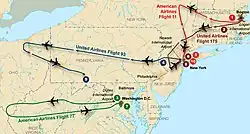 Als letzter wurde United-Airlines-Flug 93 um 9:28 Uhr von einer Vierergruppe geentert, der planmäßig mit 44 Menschen an Bord von Newark nahe New York nach San Francisco führen sollte. Die Boeing 757-200 änderte ihren Kurs um 9:32 Uhr Richtung Osten. Um 9:55 Uhr gab einer der Entführer die Frequenz einer Navigationsanlage des Ronald-Reagan-Flughafens in den Bordcomputer ein, um die Navigation in Richtung Washington D.C. zu ermöglichen.[19] Die Flugüberwachung bestätigte den Kurswechsel.[20] Als Anschlagsziel wurden später das Weiße Haus, das Kapitol oder der Landsitz des US-Präsidenten in Camp David vermutet. In einem Interview mit dem Al-Jazeera-Redakteur Yosri Fouda vom Juni 2002 sagte Ramzi Binalshib von der Hamburger Terrorzelle, dass das vierte Flugzeug das Kapitol treffen sollte.[21]
