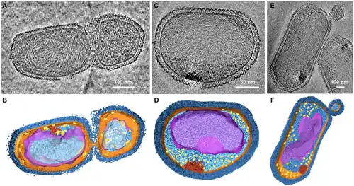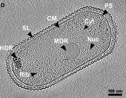 MDR: Region mittlerer Dichte; HDR: Region hoher Dichte; CM: Zytoplasmamembran; SL, Oberflächenschicht (S-Layer); Nuc: Nucleoid; Rib: Ribosom; PS: pseudoperiplasmatischer Raum; Cyt: Cytoplasma