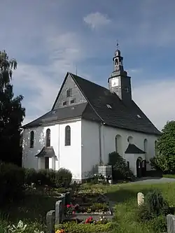 Eine evangelische Filialkirche wurde unter Benutzung älterer Mauern im Jahr 1657 als Saalkirche gebaut. Renovierungen erfolgten 1730 und 1840. Anbauten wurden 1913 errichtet. Der Saal enthält einen polygonal, dreiseitig geschlossenen Chor und eine Balkendecke. Die Empore weist in den Brüstungsfeldern gemalte Szenen des Alten Testaments aus dem 18. Jahrhundert auf. Die Kanzel aus dem 17. Jahrhundert stammt aus der ehemaligen Schlosskirche zu Rothenthal. Es existieren Reste eines Flügelaltars mit farbig gefassten Schnitzfiguren des ausgehenden 15. Jahrhunderts.[7]