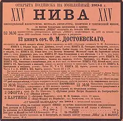 Niwa (russisch Нива, wiss. Transliteration Niva «Ни́ва», dt.: „Getreidefeld“) war eine russische wöchentliche Literaturzeitschrift (Journal) mit Beilagen. Sie erschien 48 Jahre lang, vom 18. (30.) Dezember 1869 18. Dezemberjul. / 30. Dezember 1869greg. bis zum 28. September 1918, im Verlag von Adolf Marcks in Sankt Petersburg.[1] Die Zeitschrift positionierte sich als familienfreundliches Magazin und richtete sich an eine breite Leserschaft. Die Publikation umfasste literarische Werke, historische, populärwissenschaftliche sowie verschiedene Jubiläumsaufsätze, Reproduktionen und Kupferstiche von Gemälden zeitgenössischer Künstler. Materialien politischen und sozialen Inhalts wurden in „wohlmeinendem“ Ton wiedergegeben und mit zahlreichen Abbildungen versehen – bis zum Beginn des 20. Jahrhunderts wurden meist Kupferstiche abgebildet, später fotografische Rezensionen.