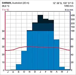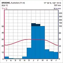 Auf seinem langen Weg über das im Jahresmittel wärmste Meeresgebiet der Erde kann die Luft sich mit reichlich Wasserdampf vollsaugen. Trifft sie dann auf die australische Küste, bringt sie je nach Lage und Höhe der Gebirgskämme üppige Sommerregen. Der Januar ist mit durchschnittlich 400 mm der feuchteste Monat. In Kimberley steigt das Land von der Küste zum Mount Hann in weniger als 100 km auf 776 m an, damit fallen wegen Luveffekten so viele Niederschläge, dass das Erdreich an den Hängen großflächig denudiert und in die Tieflandsavannen gespült wird (siehe Klimadiagramme). Dagegen sorgt das Hitzetief im Outback Australiens für warme und trockene Verhältnisse, besonders im Lee der Gebirge. Die hier herrschenden Tagestemperaturen von teilweise über 40 °C machen das Hinterland Kimberleys zum heißesten Ort der Südhalbkugel.