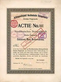 - ↑ Hinweis: Der notarielle Gesellschaftsvertrag datiert vom 2. Oktober 1869 und weist ein Grundkapital von 125 000 Reichstalern Kurant auf