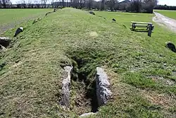 - ↑ Eingetiefte Anlagen bringen jene stabilisierenden Elemente weitgehend mit, die oberirdische errichtete Anlagen durch Steinpackungen und dergleichen in einem Hügel erhalten. Sie brauchen auch keine einwärts geneigten Tragsteine, haben sie gelegentlich aus anderen Gründen aber trotzdem