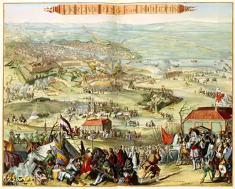 Um das belagerte Christianstadt zu entsetzen, brach der dänische König Christian V. am 23. März 1678 nach Schonen auf, um von Landskrona aus ein Entsatzheer zusammenzuziehen, was jedoch scheiterte. Die auf 1400 Mann zusammengeschmolzene dänische Garnison unter Generalmajor von der Osten musste jedoch nach viermonatiger Belagerung, aufgrund ihrer schlechten Versorgungslage, kapitulieren.[32]