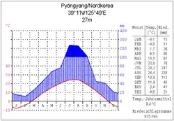 Nordkorea besitzt im Wesentlichen ein gemäßigtes Kontinentalklima mit vier ausgeprägten Jahreszeiten. Der Jahresniederschlag fällt hauptsächlich während des Monsuns (jangma) im Zeitraum von Juni bis August. Die Wintermonate sind durch Kälte und Trockenheit gekennzeichnet. Im Herbst ist das Land gelegentlich von Taifunen betroffen. Ein solcher Taifun traf besonders den Nordosten des Landes im August 2015 schwer.