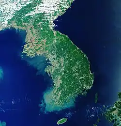 Im Norden grenzt das Land an die Volksrepublik China. Im äußersten Nordosten kommt ein etwa 19 Kilometer kurzer Grenzstreifen zu Russland hinzu – entlang des Flusses Tumen bis zur Mündung in den Pazifik. Nordkoreas Westküste liegt an der Koreabucht, einem Teil des Gelben Meeres. Im Süden bildet die Militärische Demarkationslinie in der Mitte der demilitarisierten Zone die faktische Grenze zu Südkorea (Republik Korea). Im Osten befindet sich das Japanische Meer, das von den Nordkoreanern als Koreanisches Ostmeer bezeichnet wird.[18][19] In den Namensstreit um das Japanische Meer ist auch Südkorea verwickelt.